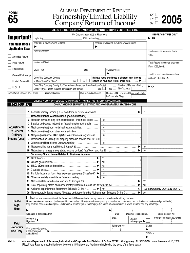 The Alabama Partnership Income Tax Form 65 is a state income tax return used by partnerships and LLCs to report their income for the calendar year 2005 or fiscal year.