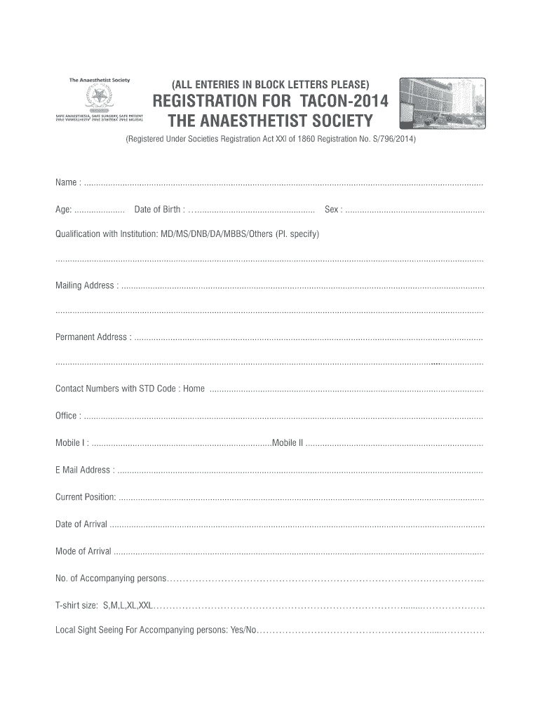 The Anesthetist Society SAFE Anesthesia, Anesthesia, SAFE SURGERY, SURGERY, SAFE PATIENT SAFE (ALL ENTRIES IN BLOCK LETTERS PLEASE) REGISTRATION FOR TACON2014 THE Anesthetist SOCIETY (Registered Under