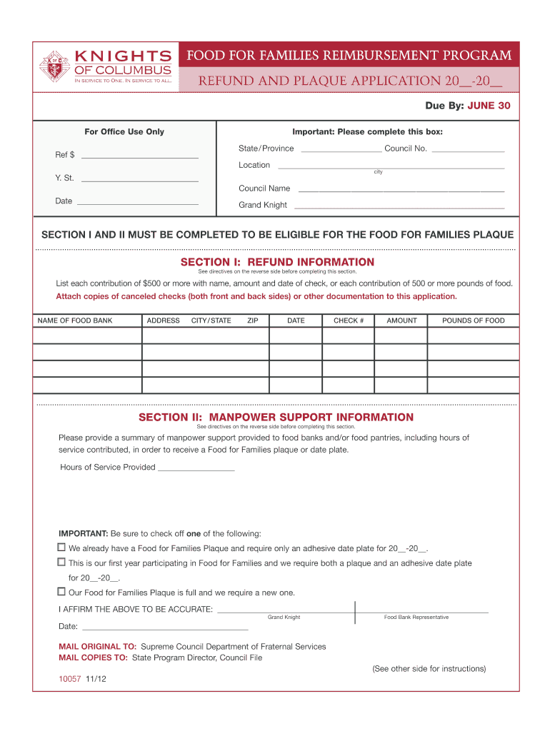FOOD FOR FAMILIES REIMBURSEMENT PROGRAM REFUND AND PLAQUE APPLICATION 20 20 Due By: JUNE 30 For Office Use Only Important: Please complete this box: Ref $ State / Province Council No. Location city