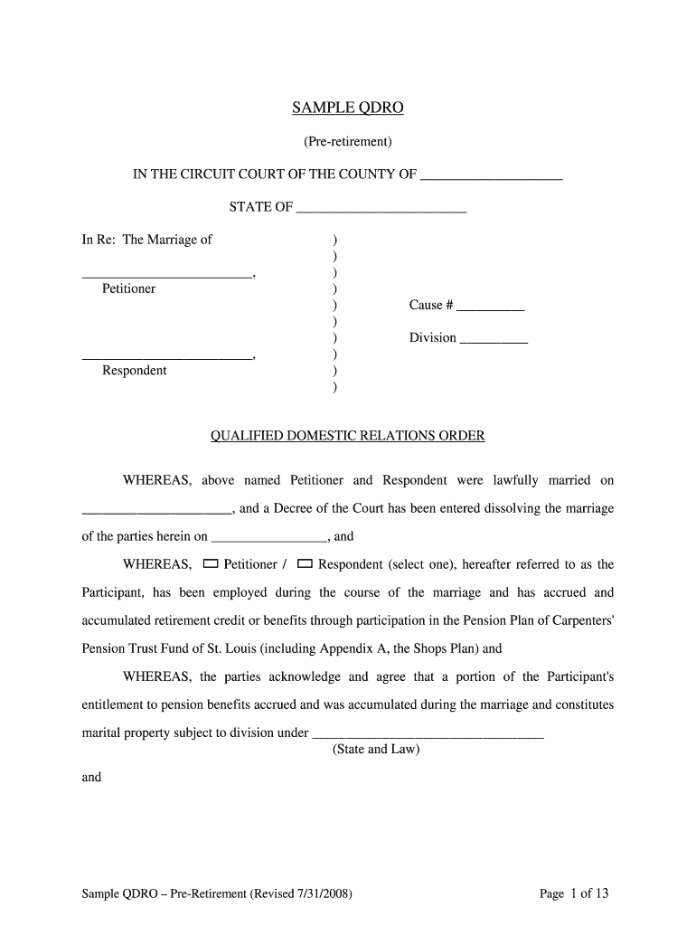 Get the free 2008 REVISION SAMPLE QDRO - Pre Retirementdoc - carpdc