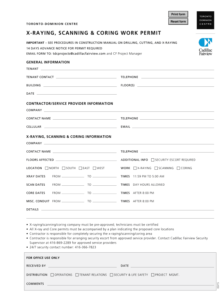 Print form Reset form T o r o n t o D o m i n i o n C e n t r e X-ray i n g, SC an n i n g & c or in g work p e r m i t IMPORTANT See procedures in Construction Manual on Drilling, Cutting, and Praying