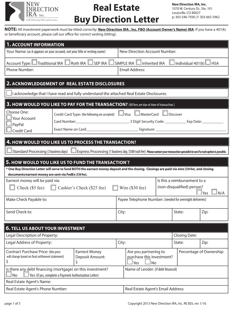 Real Estate Buy Direction Letter Self-directed IRAs and more... New Direction IRA, Inc. 1070 W. Century Dr., Ste. 101 Louisville, CO 80027 p: 3035467930 f: 3036655962 NOTE: All investment paperwork