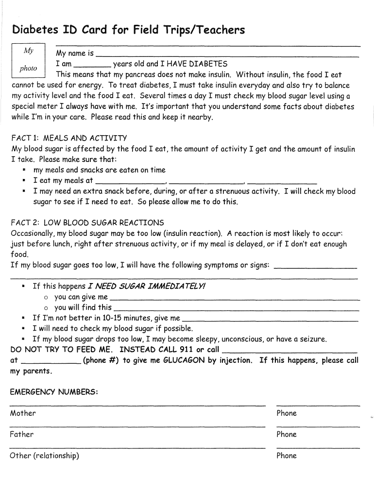 Diabetes lb Card for Field Trips/Teachers