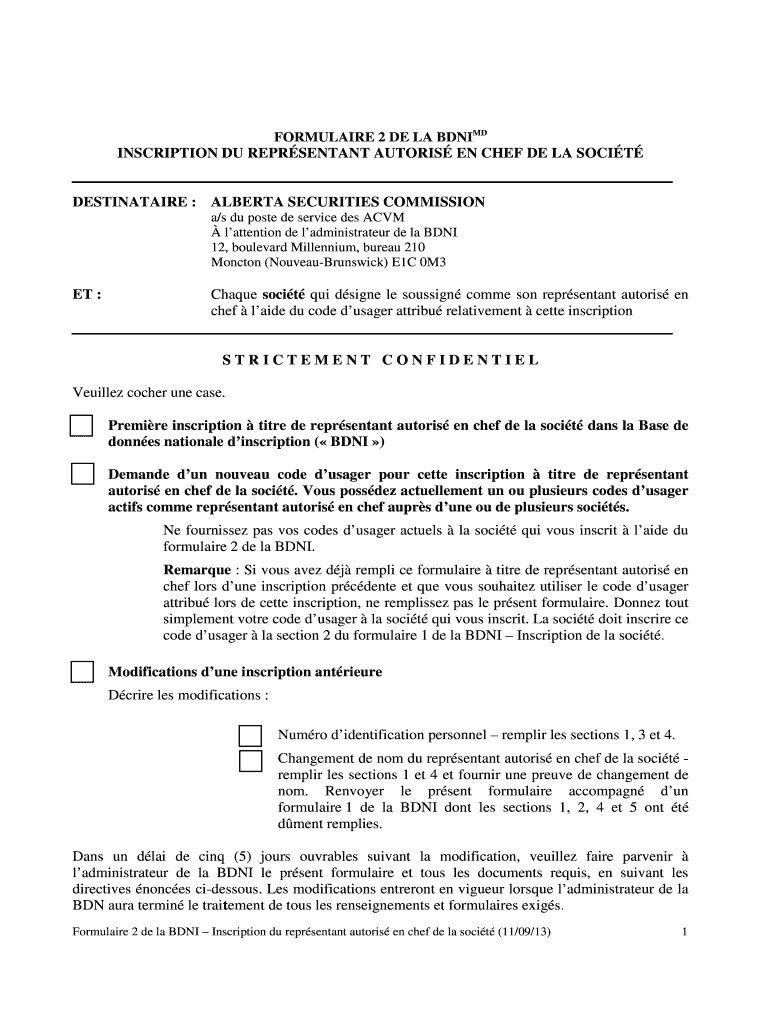 FORMULA IRE 2 DE LA BDN IMD INSCRIPTION DU REPENTANT AUTORIS EN CHEF DE LA SO CIT DESTINATION : ALBERTA SECURITIES COMMISSION a/s Du post DE service DES ACM attention DE administrator DE la BANI 12,