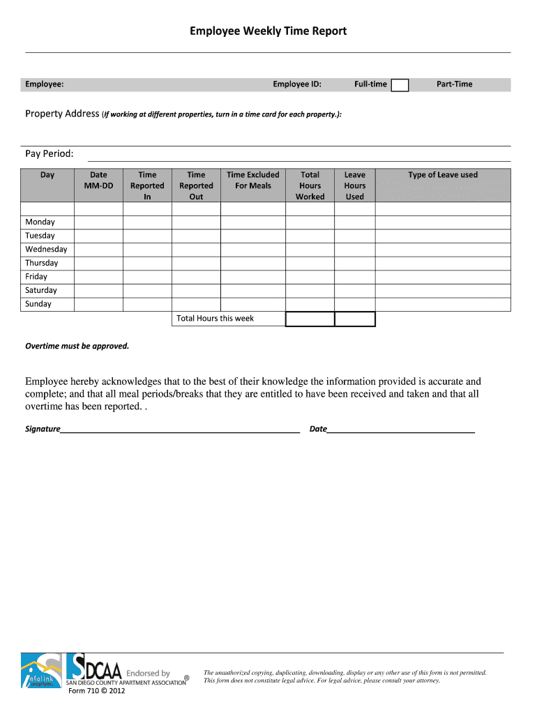 EmployeeWeeklyTimeReport Employee: Employee ID: Full time Maritime PropertyAddress(Ifworkingatdifferentproperties, turninatimecardforeachproperty.): Period: Day Date MDD Monday Tuesday Wednesday Thursday