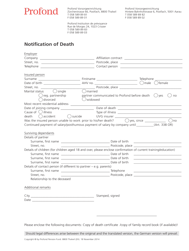 Get the free Notification of Death - Profond Vorsorgeeinrichtung - profond-vorsorgeeinrichtung