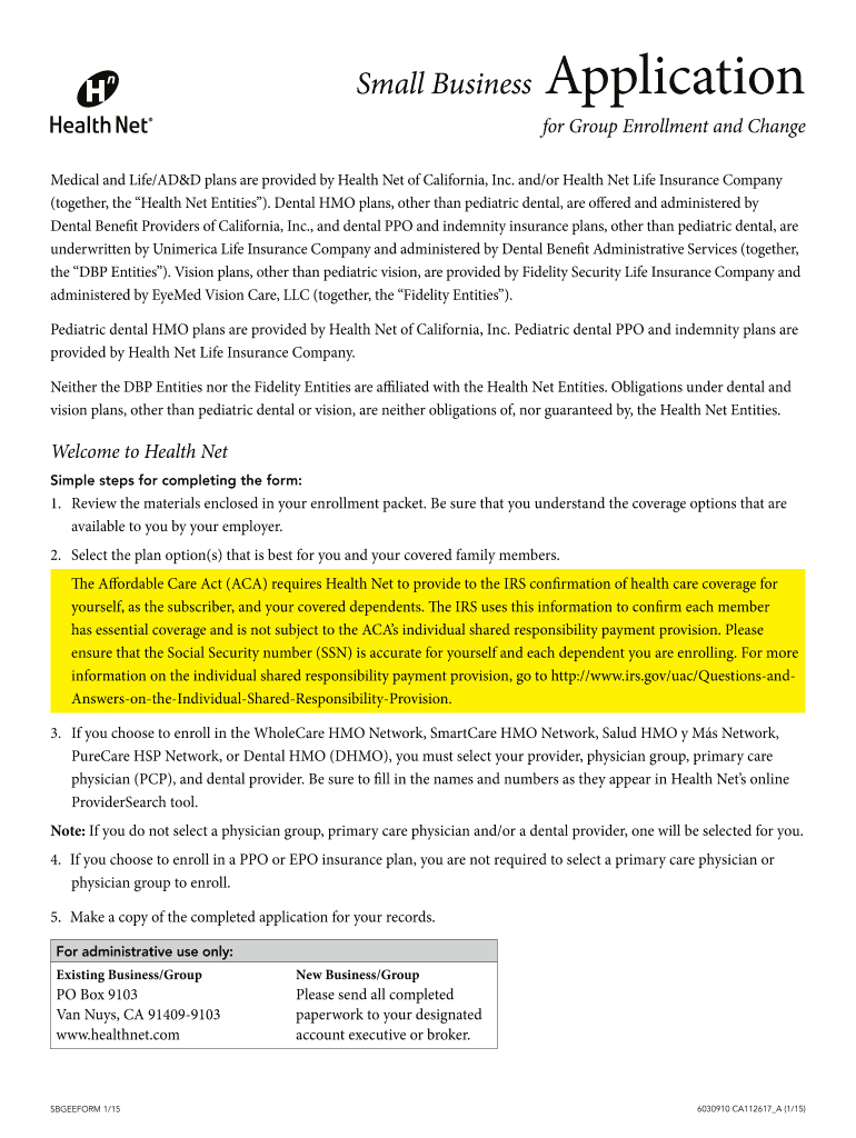 Small Business Application for Group Enrollment and Change Medical and Life/ADD plans are provided by Health Net of California, Inc. and/or Health Net Life Insurance Company (together, the Health