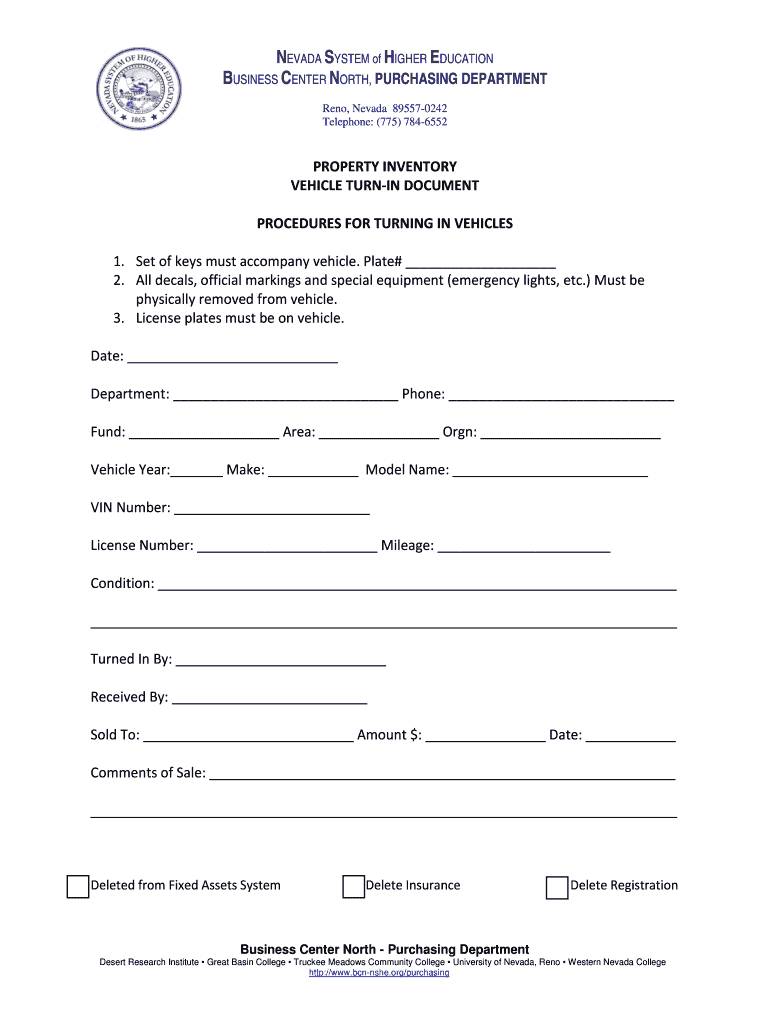 NEVADA SYSTEM of HIGHER EDUCATION BUSINESS CENTER NORTH, PURCHASING DEPARTMENT Reno, Nevada 895570242 Telephone: (775) 7846552 PROPERTY INVENTORY VEHICLE TURNING DOCUMENT PROCEDURES FOR TURNING IN