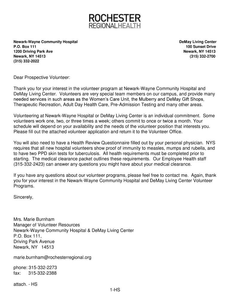 Newark Wayne Community Hospital P.O. Box 111 1200 Driving Park Ave Newark, NY 14513 (315) 3322022 Delay Living Center 100 Sunset Drive Newark, NY 14513 (315) 3322700 Dear Prospective Volunteer: Thank