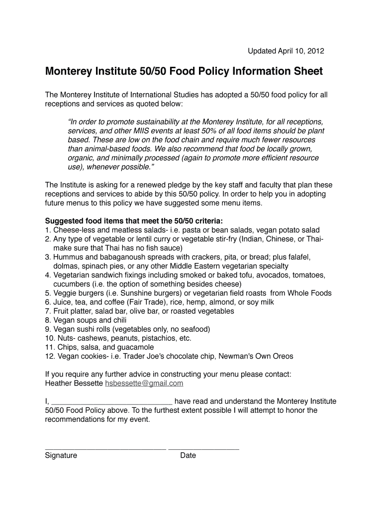 ! ! ! ! ! ! ! ! ! Updated April 10, 2012, Monterey Institute 50/50 Food Policy Information Sheet The Monterey Institute of International Studies has adopted a 50/50 food policy for all receptions