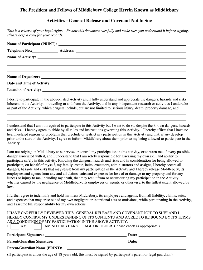 The President and Fellows of Middlebury College Herein Known as Middlebury Activities General Release and Covenant Not to Sue This is a release of your legal rights. Review this document carefully
