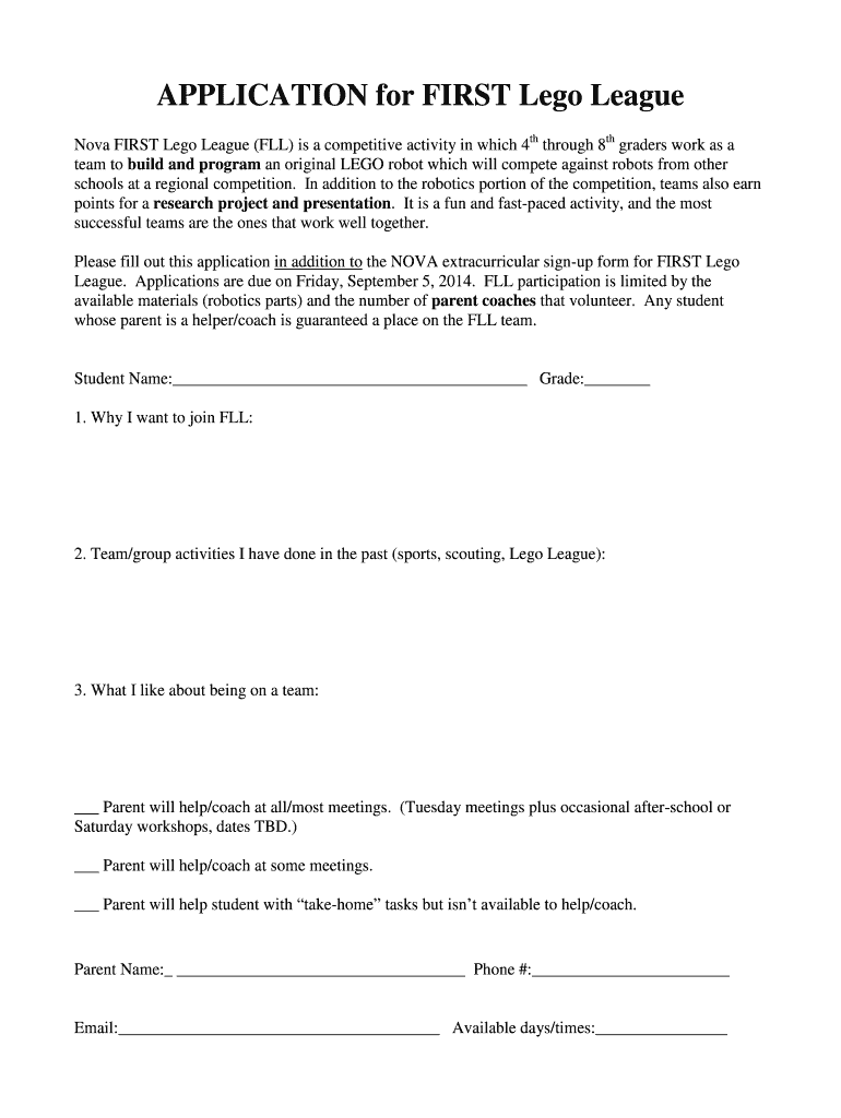 APPLICATION for FIRST Lego League Nova FIRST Lego League (FLL) is a competitive activity in which 4th through 8th graders work as a team to build and program an original LEGO robot which will compete