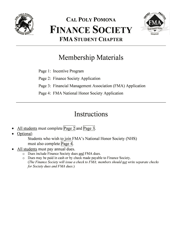 CAL POLY POMONA FINANCE SOCIETY FMA STUDENT CHAPTER Membership Materials Page 1: Incentive Program Page 2: Finance Society Application Page 3: Financial Management Association (FMA) Application Page