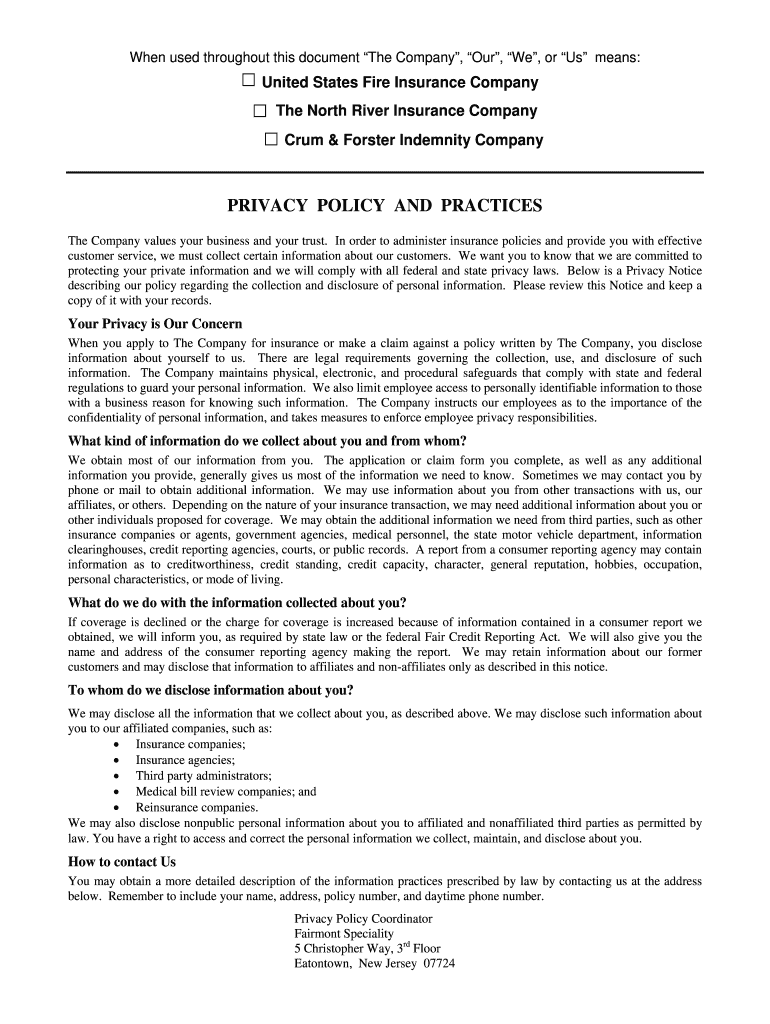 When used throughout this document The Company, Our, We, or Us means: United States Fire Insurance Company The North River Insurance Company Drum & Forster Indemnity Company PRIVACY POLICY AND PRACTICES