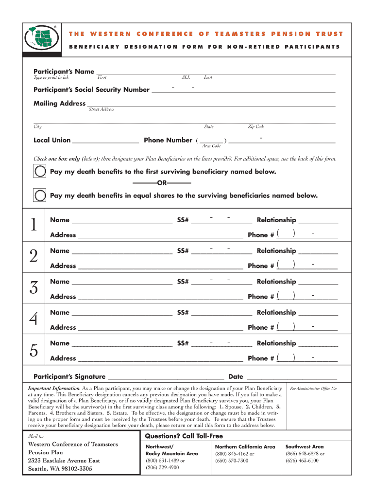THE WESTERN BENEFICIARY CONFERENCE D E S I G N AT I O N OF FORM TEAMSTERS FOR PENSION RETIRED TRUST PA RT I C I PA N T S Participants Name Type or print in ink First M.I. Last Participants Social