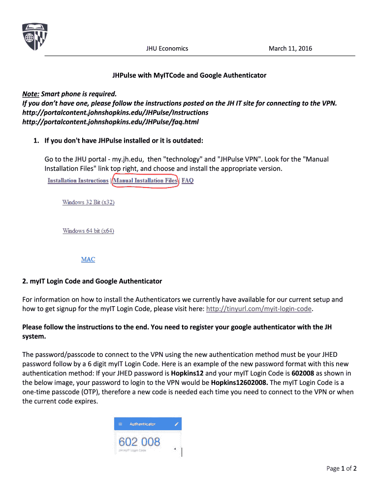 JHU Economics March 11, 2016JHPulse with Unicode and Google Authenticator Note: Smartphone is required. If you don't have one, please follow the instructions posted on the JR IT site for connecting
