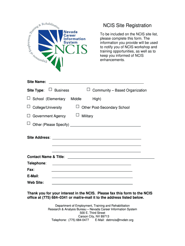 This form is used to register a site with the NCIS for notifying about workshop and training opportunities, and for keeping informed about NCIS enhancements.