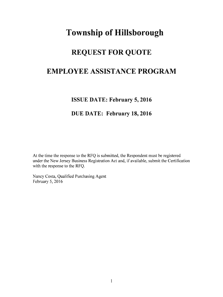 Township of Hillsborough REQUEST FOR QUOTE EMPLOYEE ASSISTANCE PROGRAM ISSUE DATE: February 5, 2016, DUE DATE: February 18, 2016, At the time the response to the RFQ is submitted, the Respondent must