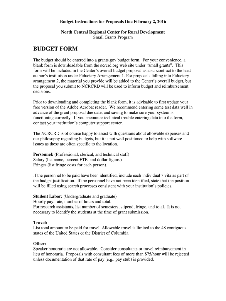 Budget Instructions for Proposals Due February 2, 2016, North Central Regional Center for Rural Development Small Grants Program BUDGET FORM The budget should be entered into a grants.gov budget form.