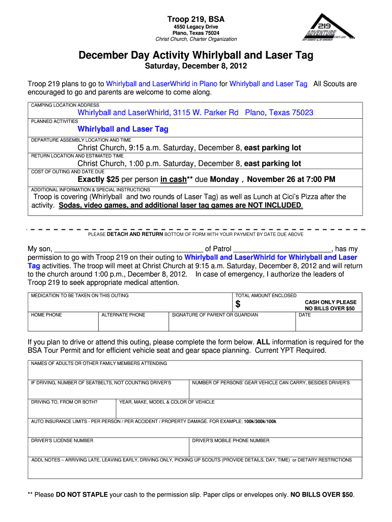 Troop 219, BSA 4550 Legacy Drive Plano, Texas 75024 Christ Church, Charter Organization December Day Activity Whirlybird and Laser Tag Saturday, December 8, 2012, Troop 219 plans to go to Whirlybird