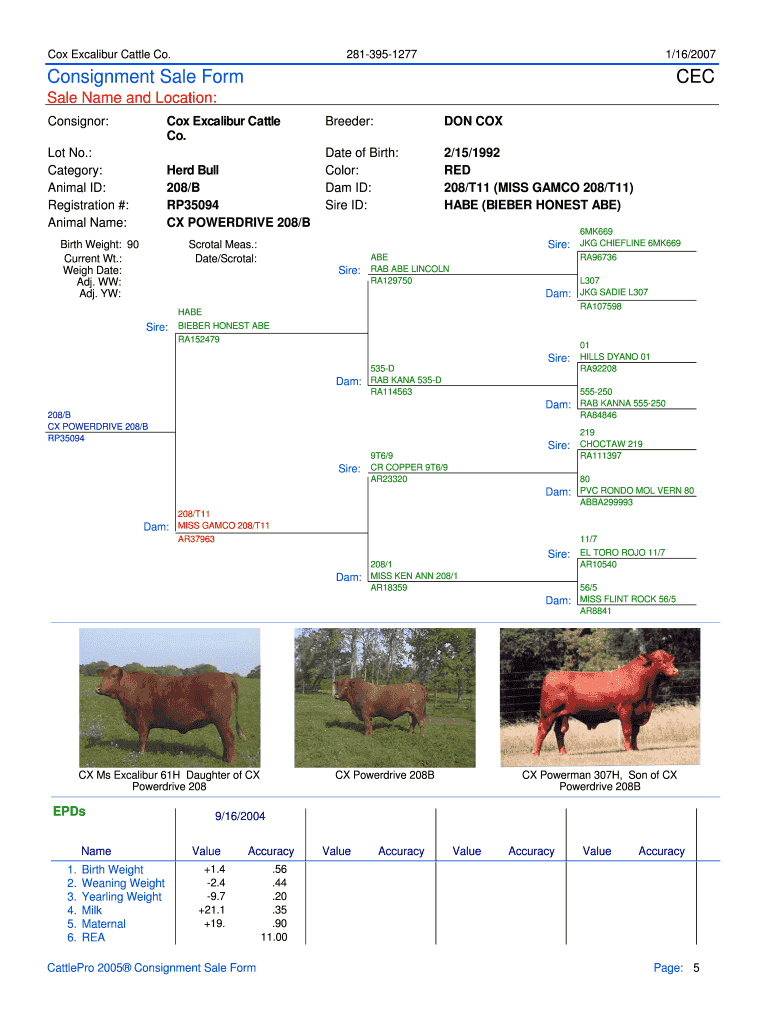 Cox Excalibur Cattle Co. 2813951277 1/16/2007 Consignment Sale Form CEC Sale Name and Location: Consignor: Cox Excalibur Cattle Co. Lot No.: Category: Animal ID: Registration #: Animal Name: Herd