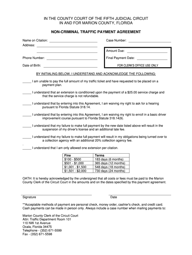 IN THE COUNTY COURT OF THE FIFTH JUDICIAL CIRCUIT IN AND FOR MARION COUNTY, FLORIDA NONCRIMINAL TRAFFIC PAYMENT AGREEMENT Name on Citation: Address: Case Number: Amount Due: Phone Number: Final Payment