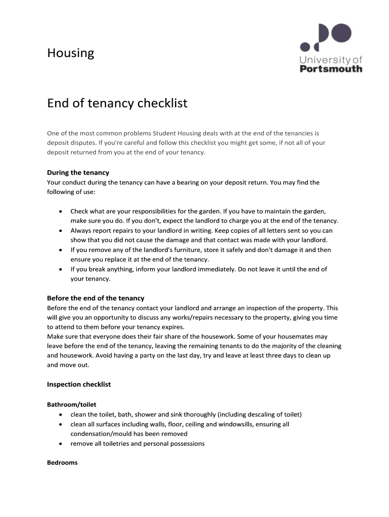 Housing of tenancy checklist One of the most common problems Student Housing deals with at the end of the tenancies is deposit disputes. If you're careful and follow this checklist you might get some,