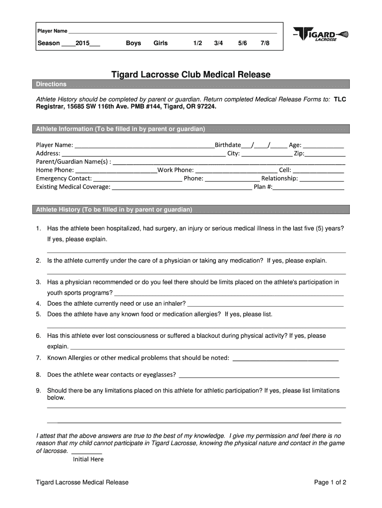 Player Name Season 2015 Boys Girls 1/2 3/4 5/6 7/8 Tigard Lacrosse Club Medical Release Directions Athlete History should be completed by parent or guardian. Return completed Medical Release Forms
