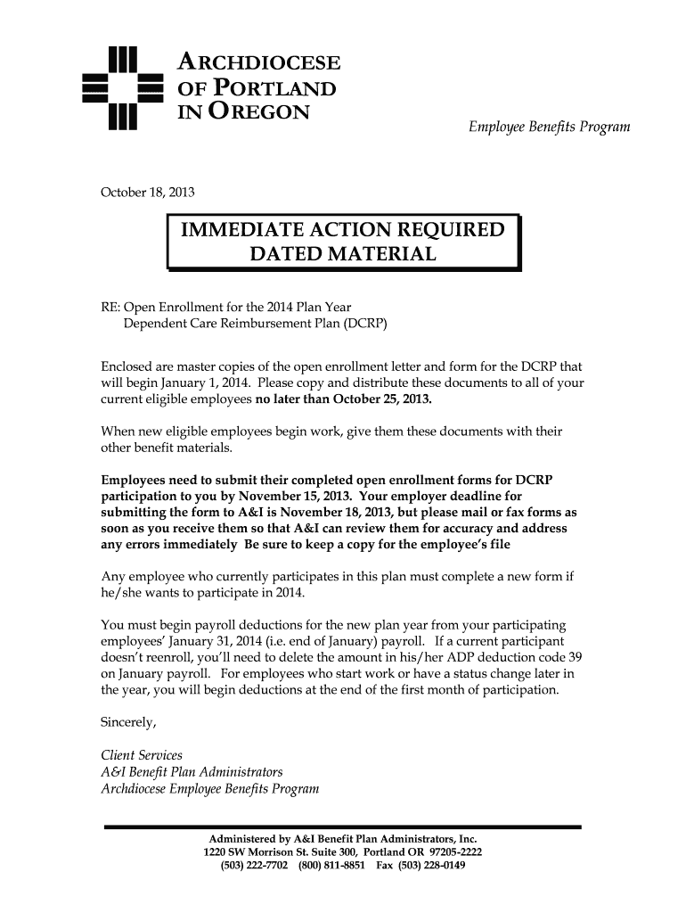 A ARCHDIOCESE OF PORTLAND IN O REGION Employee Benefits Program October 18, 2013, IMMEDIATE ACTION REQUIRED To be DATED MATERIAL RE: Open Enrollment for the 2014 Plan Year Dependent Care Reimbursement