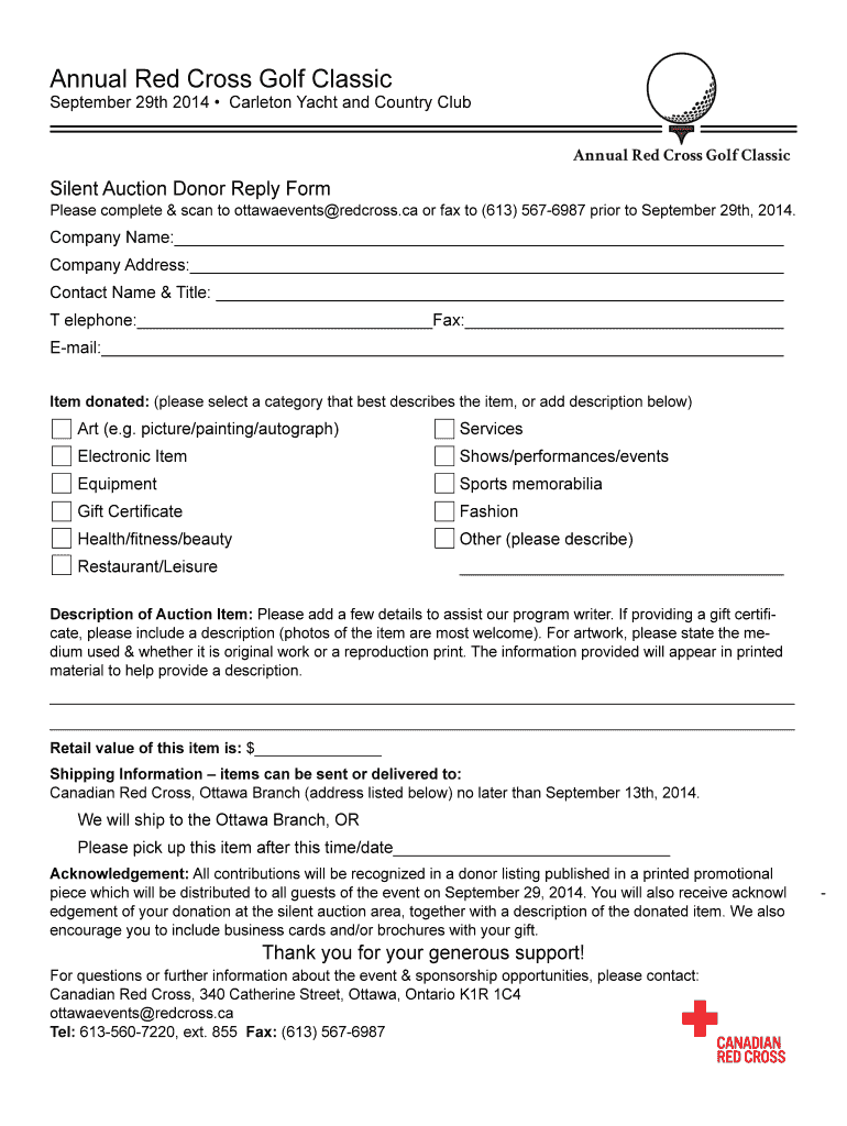 Annual Red Cross Golf Classic 4 Silent Auction Donor Reply Form Please complete & scan to ottawaevents recross.ca or fax to (613) 5676987 prior to September 29th, 2014. Company Name: Company Address: