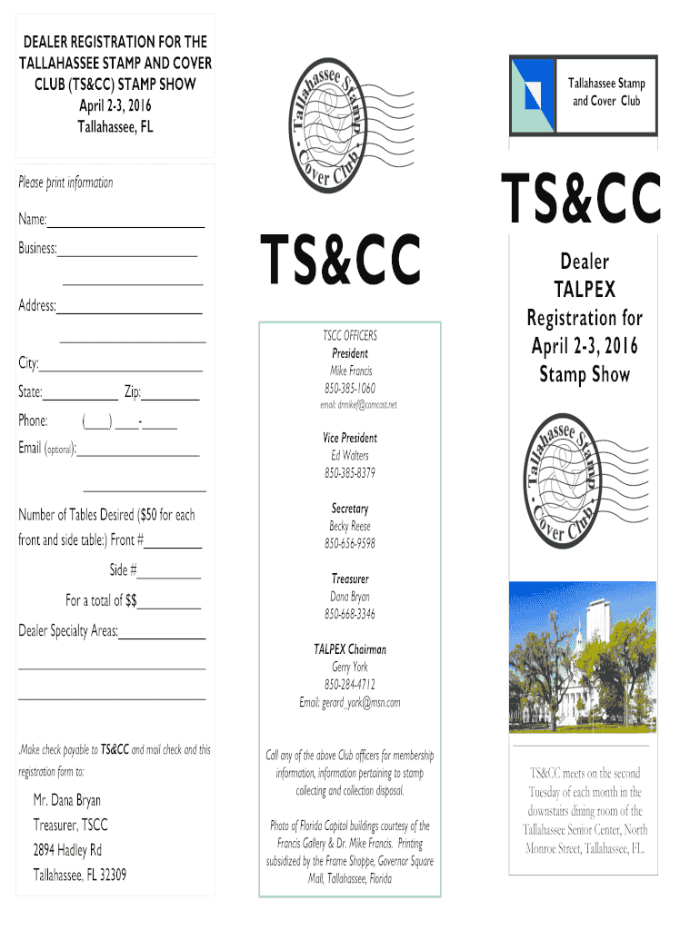 DEALER REGISTRATION FOR THE TALLAHASSEE STAMP AND COVER CLUB (SCC) STAMP SHOW April 23, 2016, Tallahassee, FL Tallahassee Stamp and Cover Club Please print information Name: Business: Address: City: