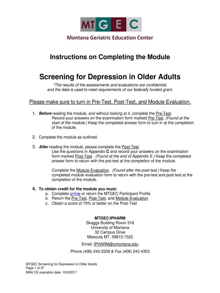 Montana Geriatric Education Center Instructions on Completing the Module Screening for Depression in Older Adults *The results of the assessments and evaluations are confidential, and the data is