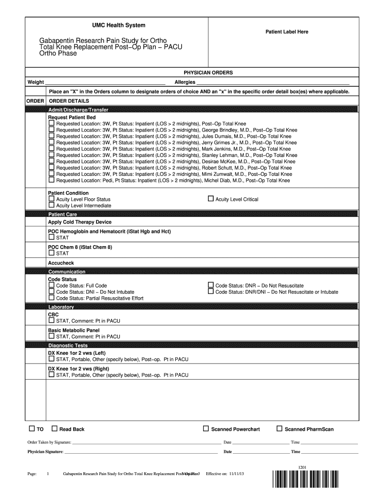 UMC Health System Patient Label Here Gabapentin Research Pain Study for Or tho Total Knee Replacement Post Plan PACE Or tho Phase PHYSICIAN ORDERS Weight Allergies Place an X in the Orders' column
