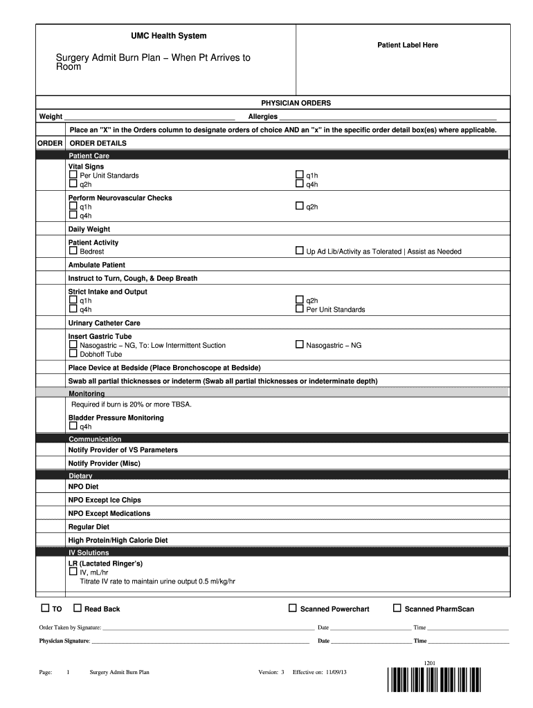 UMC Health System Patient Label Here Surgery Admit Burn Plan When Pt Arrives to Room PHYSICIAN ORDERS Weight Allergies Place an X in the Orders' column to designate orders of choice AND an x in the