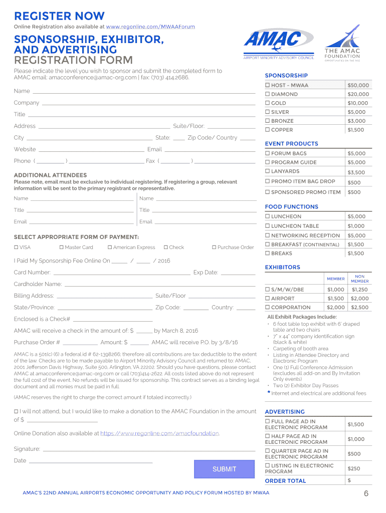 REGISTER NOW Online Registration also available at www.regonline.com/MWAAForum SPONSORSHIP, EXHIBITOR, AND ADVERTISING REGISTRATION FORM Please indicate the level you wish to sponsor and submit the