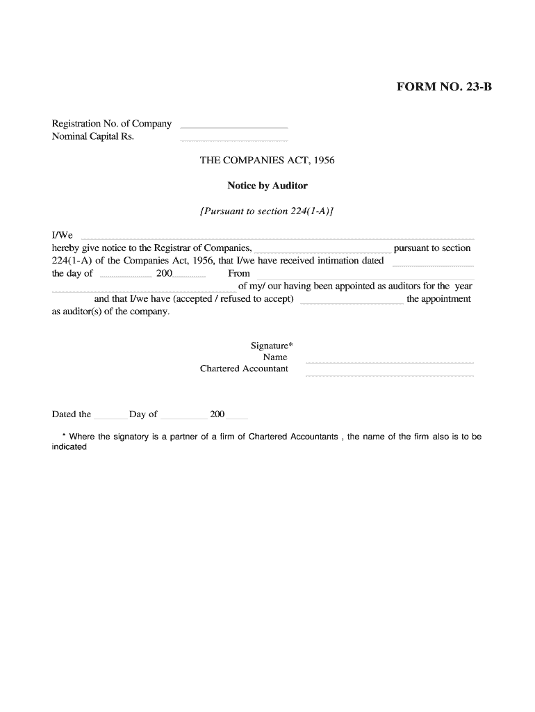 Outnumber 23B Formation 224(1A) Format Corporate FORM NO. 23B Fertile Notice by Auditor Registration No. of Company Nominal Capital Rs. x FormParentAct The Companies Act, 1956 THE COMPANIES ACT, 1956
