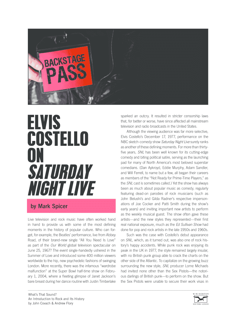 ELVIS COSTELLO ON SATURDAY NIGHT LIVE by Mark Spicer Live television and rock music have often worked hand in hand to provide us with some of the most defining moments in the history of popular culture.