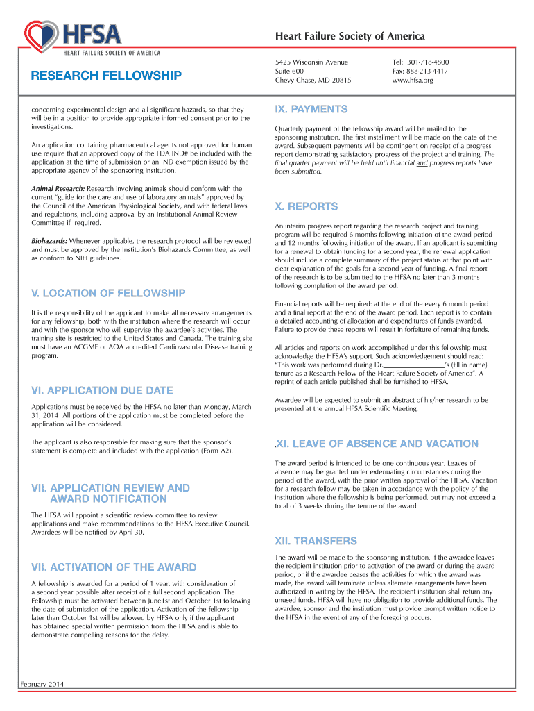 Heart Failure Society of America Research FELLOWSHIP I. Introduction The Heart Failure Society of America (FSA) has established a 1-2 year research fellowship program in heart failure. The purpose