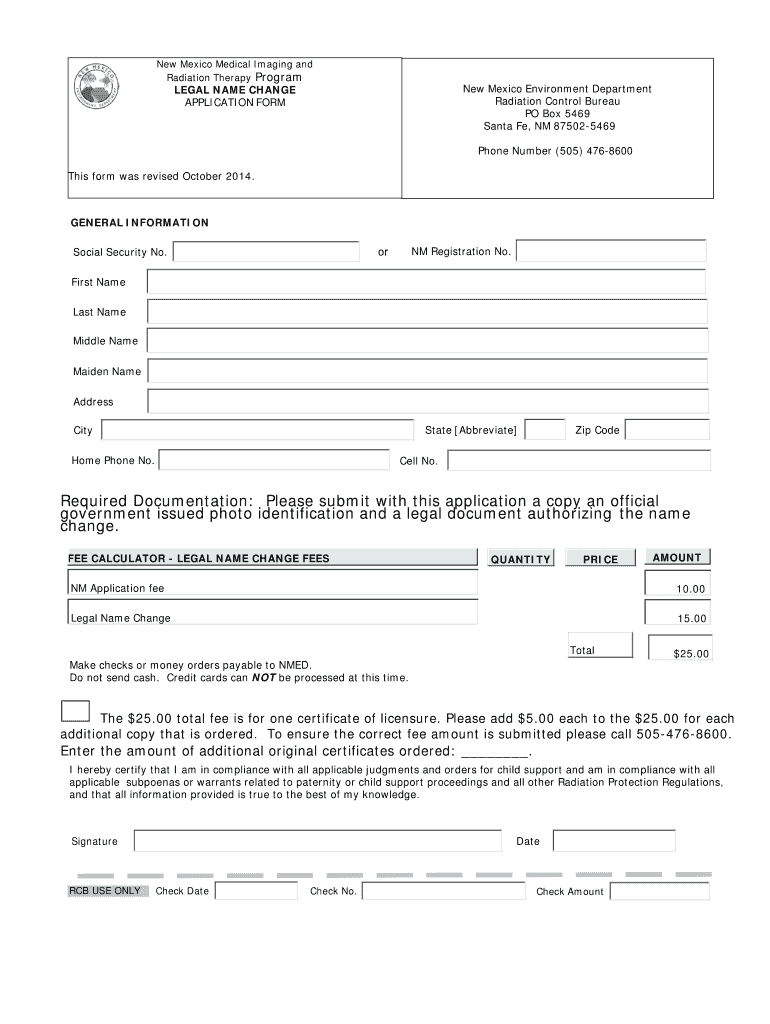 New Mexico Medical Imaging and Radiation Therapy Program New Mexico Environment Department Radiation Control Bureau PO Box 5469 Santa Fe, NM 875025469 LEGAL NAME CHANGE APPLICATION FORM Phone Number