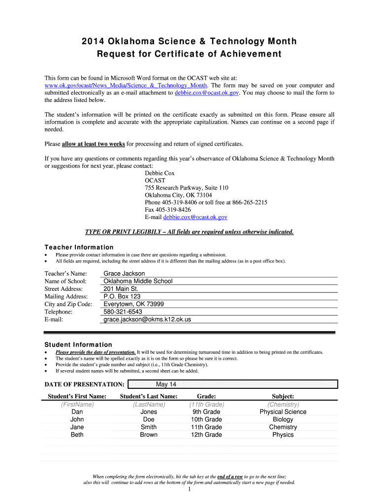 This document serves as a request form for a certificate of achievement related to the observance of Oklahoma Science & Technology Month, allowing submission of student information electronically