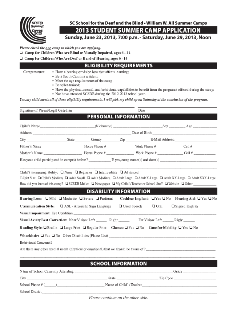 SC School for the Deaf and the Blind William W. All Summer Camps2013 STUDENT SUMMER CAMP APPLICATIONSunday, June 23, 2013, 7:00 p.m. Saturday, June 29, 2013, Noon Please check the one camp to which