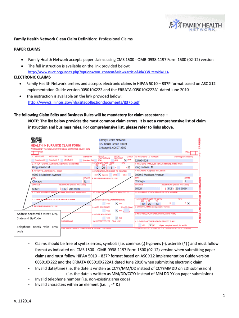Family Health Network Clean Claim Definition: Professional Claims PAPER CLAIMS Family Health Network accepts paper claims using CMS 1500 OMB09381197 Form 1500 (0212) version The full instruction is