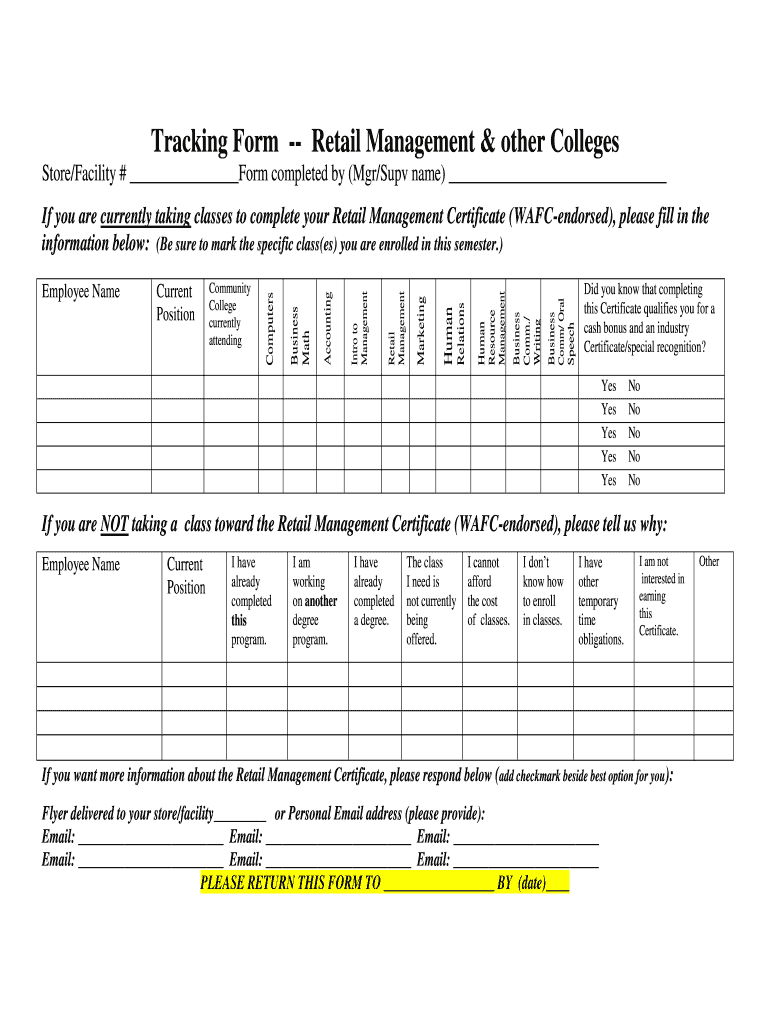 Tracking Form Retail Management & other Colleges Store/Facility # Form completed by (Mgr/SUV name) Speech Comm/ Oral Business Comm./ Writing Management Human Resource Relations Human Marketing Retail