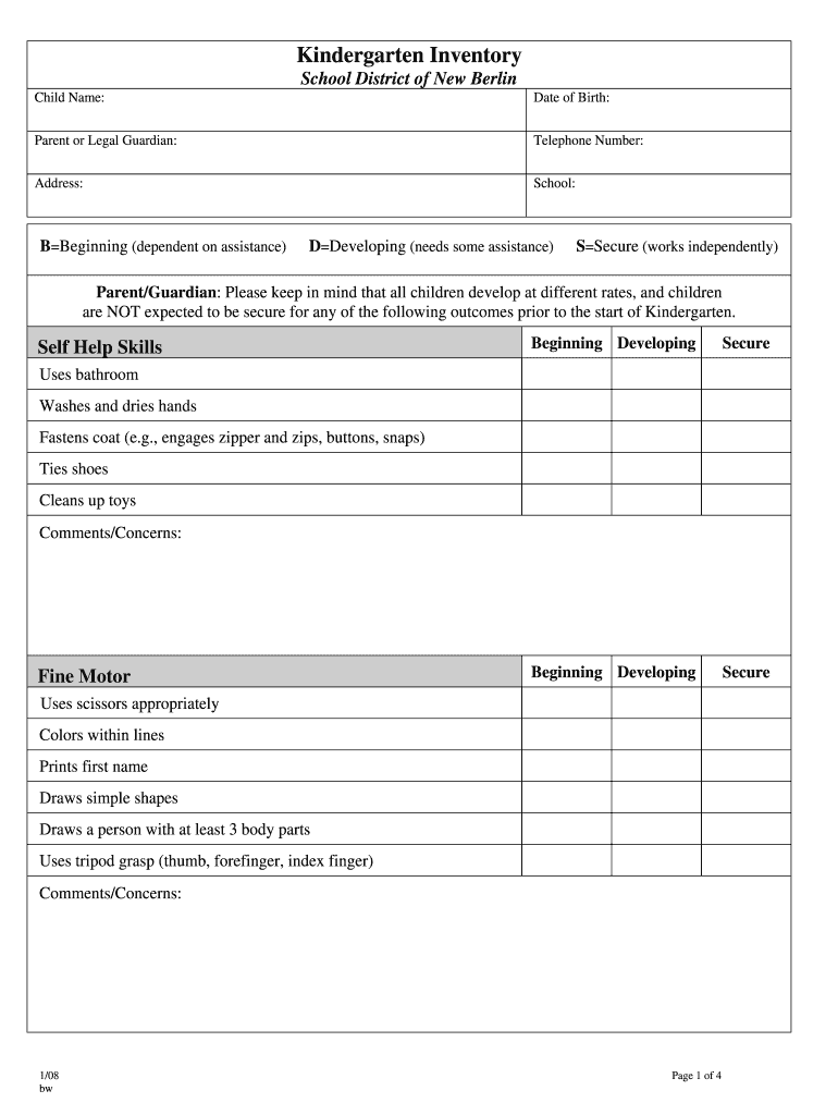 Kindergarten Inventory School District of New Berlin Child Name: Date of Birth: Parent or Legal Guardian: Telephone Number: Address: School: Beginning (dependent on assistance) Developing (needs some