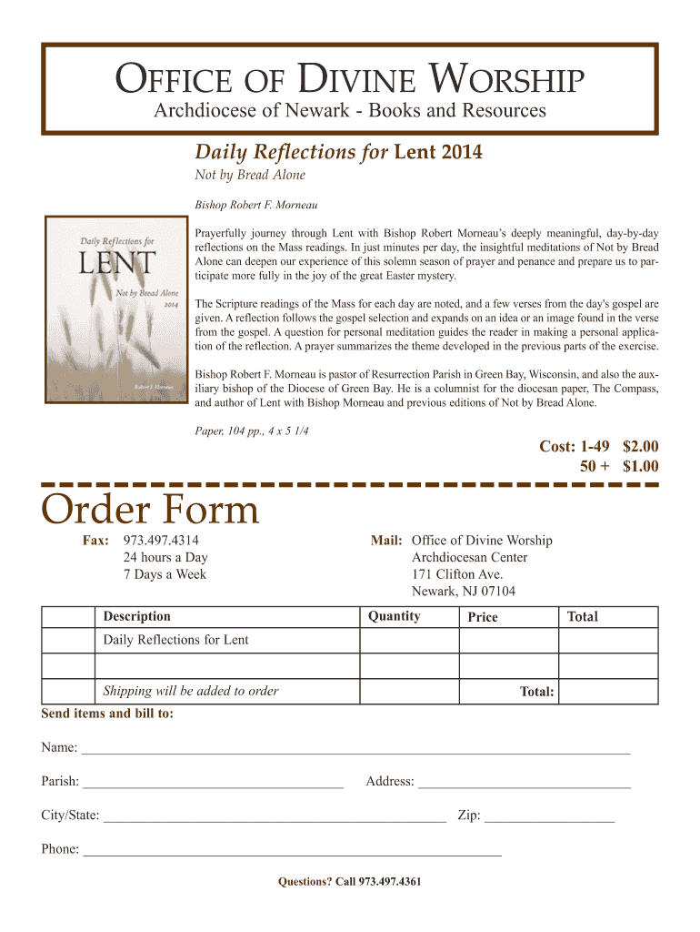 OFFICE OF DIVINE WORSHIP Archdiocese of Newark Books and Resources Daily Reflections for Lent 2014 Not by Bread Alone Bishop Robert F. Moreau Prayerfully journey through Lent with Bishop Robert Corneas
