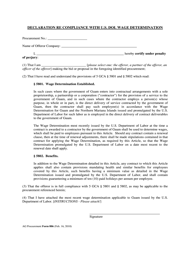 DECLARATION RE COMPLIANCE WITH U.S. DOL WAGE DETERMINATION Procurement No.: Name of Offer or Company: I, hereby certify under penalty of perjury: (1) That I am please select one: the offer or, a partner