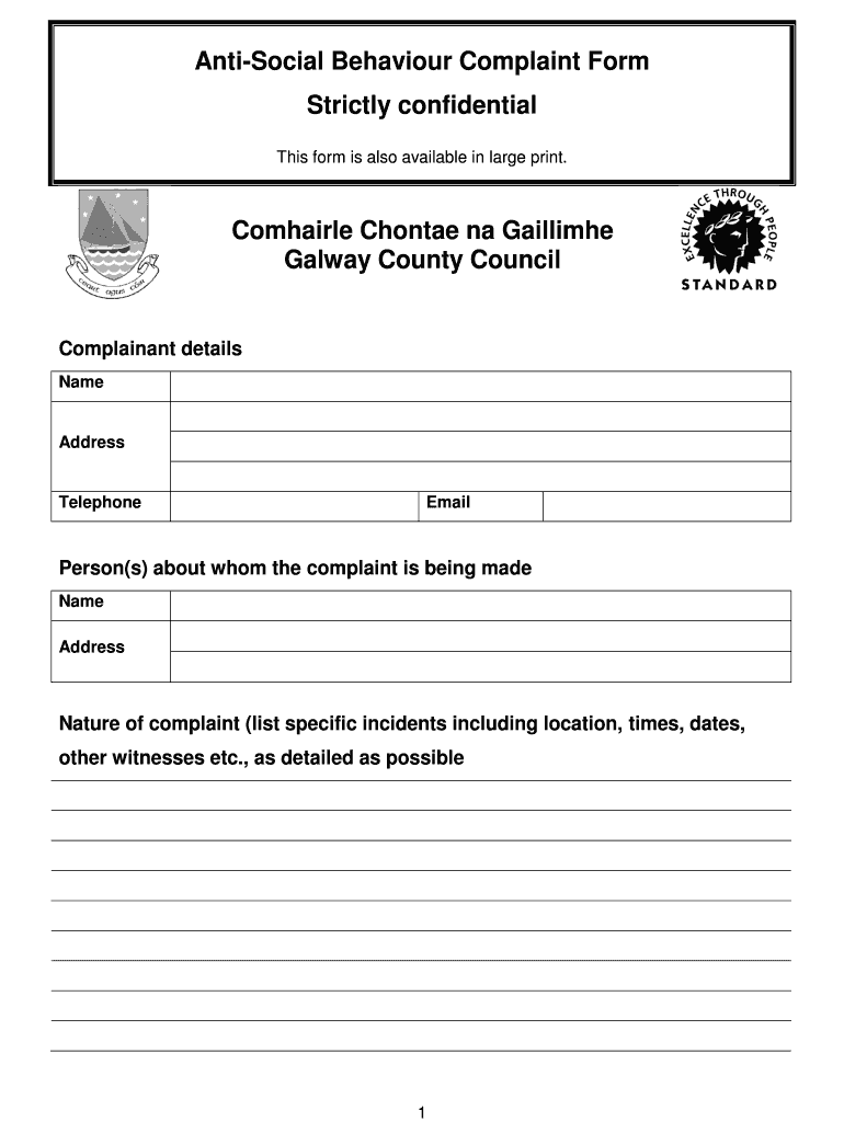Antisocial Behavior Complaint Form Strictly confidential This form is also available in large print. Compared Choctaw Na Taillight Galway County Council Complainant details Name Address Telephone