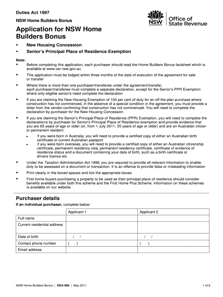 Duties Act 1997 NSW Home Builders Bonus Application for NSW Home Builders Bonus New Housing Concession Seniors Principal Place of Residence Exemption Note: Before completing this application, each