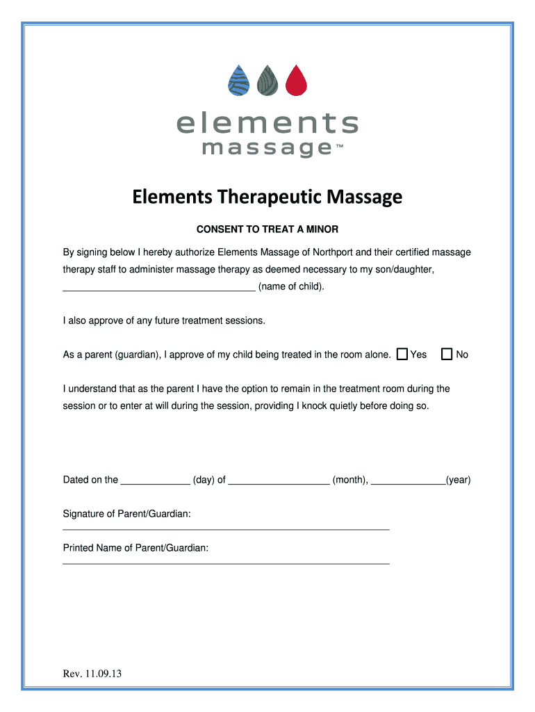 Elements Therapeutic Massage CONSENT TO TREAT A MINOR By signing below I hereby authorize Elements Massage of Northport and their certified massage therapy staff to administer massage therapy as deemed