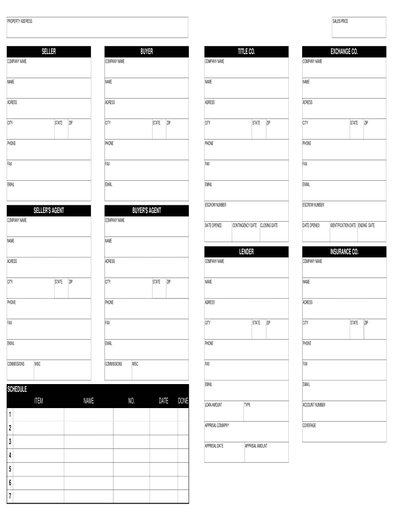 PROPERTY ADDRESS SALES PRICE SELLER BUYER TITLE CO. EXCHANGE CO. COMPANY NAME NAME NAME ADDRESS CITY STATE ZIP CITY STATE ZIP CITY STATE ZIP CITY STATE PHONE FAX EMAIL ESCROW NUMBER ZIP ESCROW NUMBER